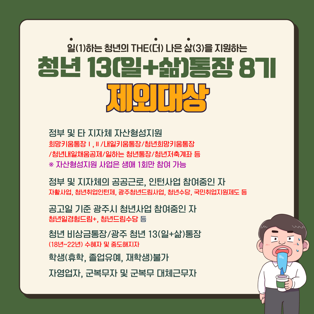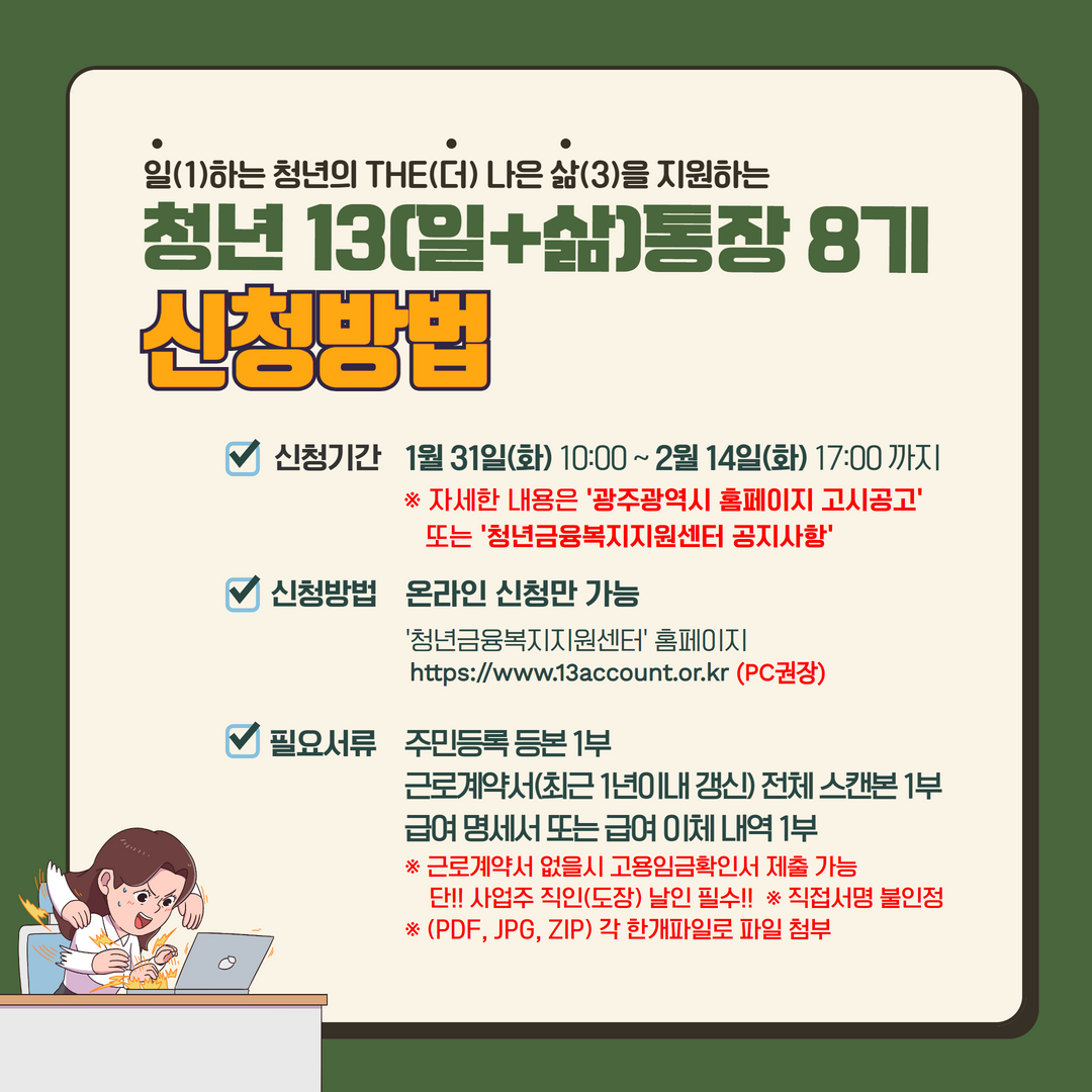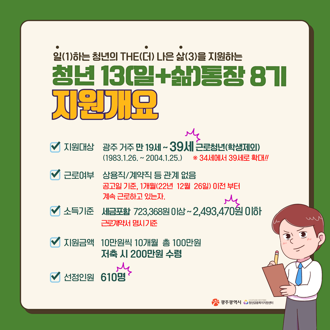 광주광역시에서 일하는 청년들의 경제적인 자립심과 생활비 안정을 위해 진행하는 사업인데요. 청년들의 의견을 적극 반영하여 더욱 확대되어 광주 청년13통장 8기를 모집하였습니다.