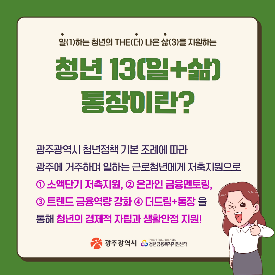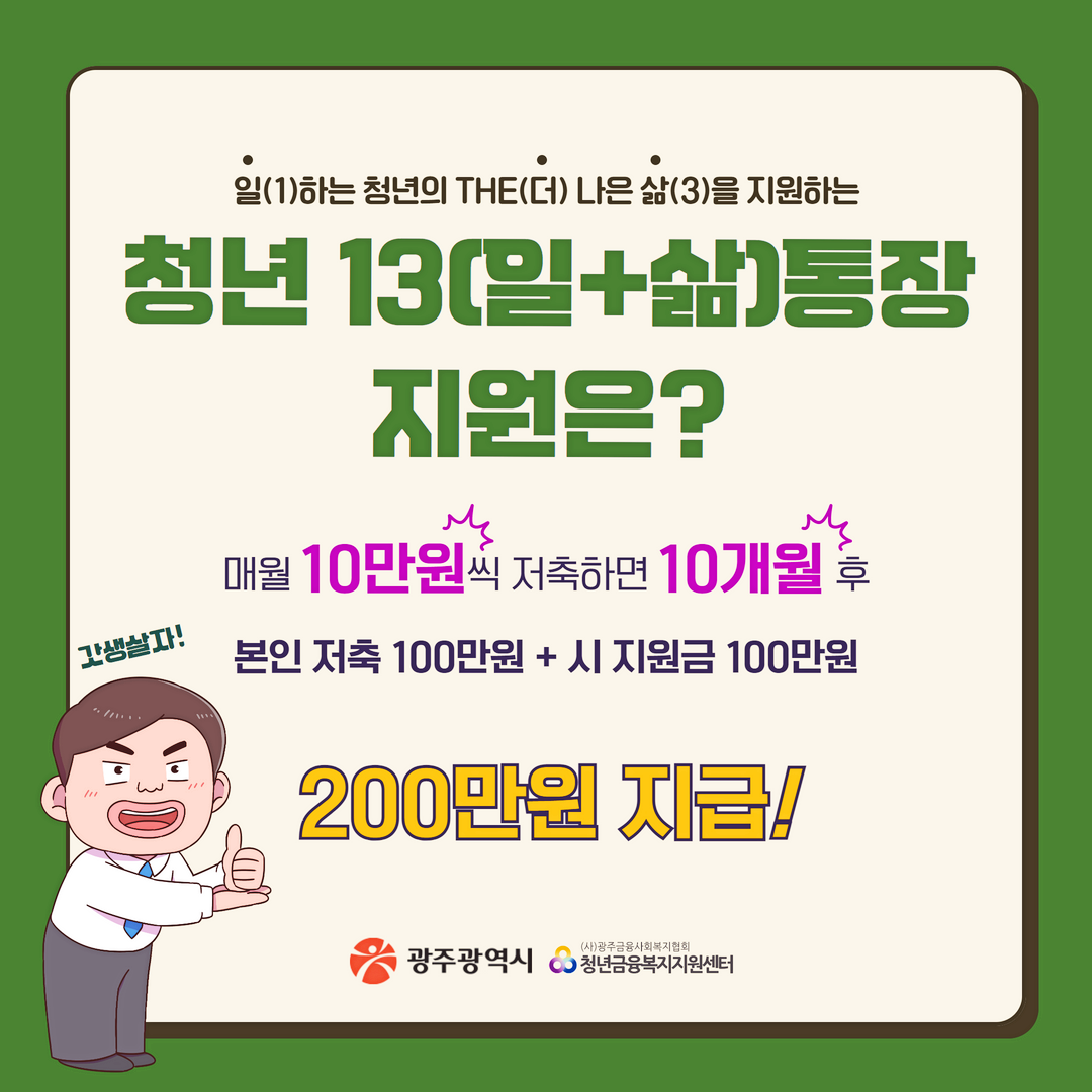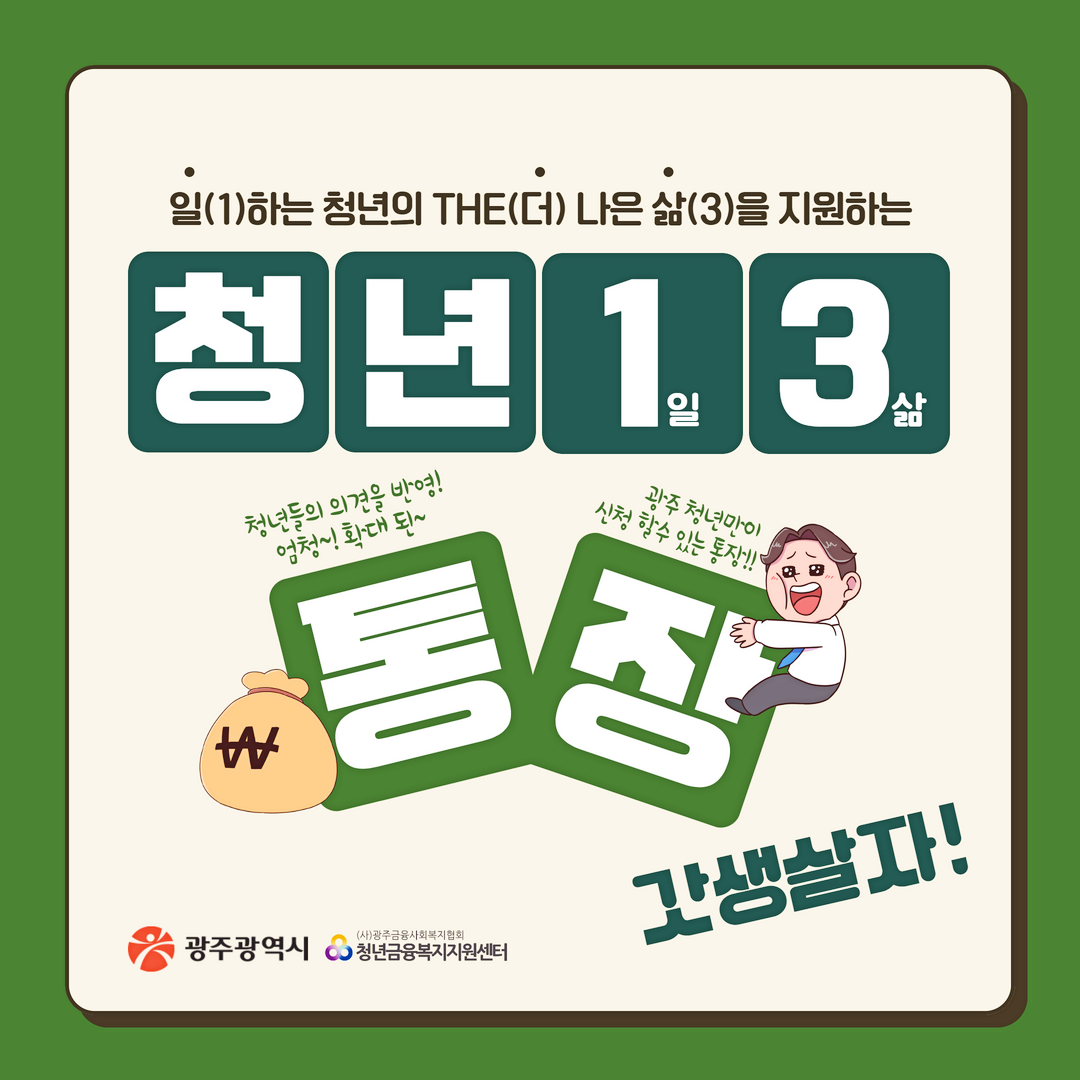광주 청년13통장을 알고 계셨나요? 이번에 8기 모집을 한 청년복지입니다. 청년13 통장으로 일(1)+삶(3), 일과 삶을 도와주는 정책으로 광주광역시에서 청년정책 기본조례법에 근거하여 일하는 청년들을 격려하기 위해 만든 것이라고 합니다.