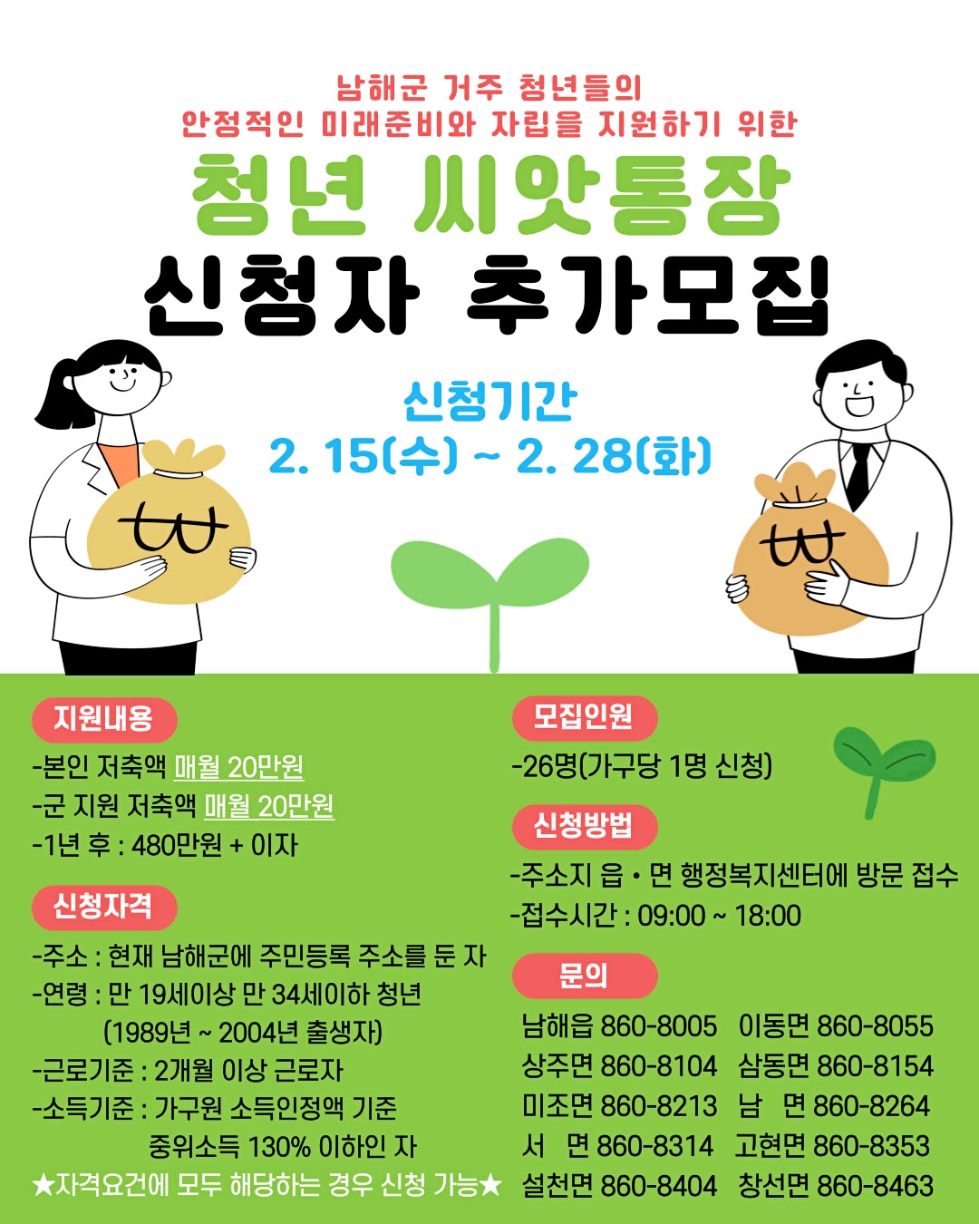 남해 청년씨앗통장 추가 모집은 2월 15일 ~ 2월 28일까지 모집 중입니다. 이번달까지 모집 중이니 현재 나와 자격요건이 맞다면 신청하는 것이 좋겠죠?