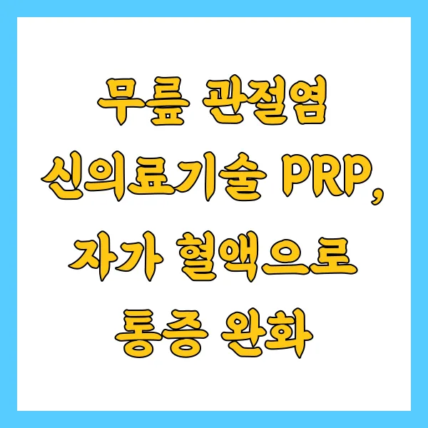 무릎 관절염으로 고통받고 계신가요? 😫 걷기, 계단 오르기, 심지어 앉았다 일어나는 것조차 힘든 당신께 희소식을 전합니다! 자가 혈소판 풍부 혈장 관절강 내 주사(PRP) 신의료기술 이 중기 무릎 골관절염 치료에 새로운 희망을 제시 합니다. 😊 PRP 치료, 과연 무엇일까요? 🤔 지금 바로 확인하세요!