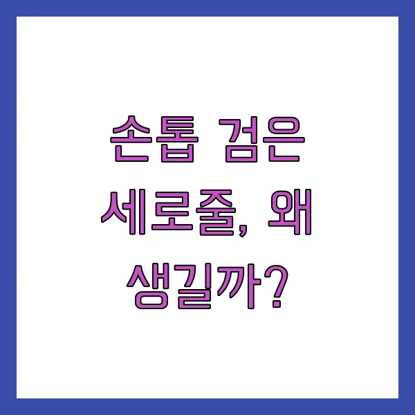 - 곰팡이 감염 (손톱 진균증) : 손톱 무좀이라고도 하죠. 손톱이 변색되고 두꺼워지면서 검은 세로줄이 나타날 수 있습니다. 초기에 치료하지 않으면 다른 손톱으로 번질 수 있으니 주의해야 합니다.