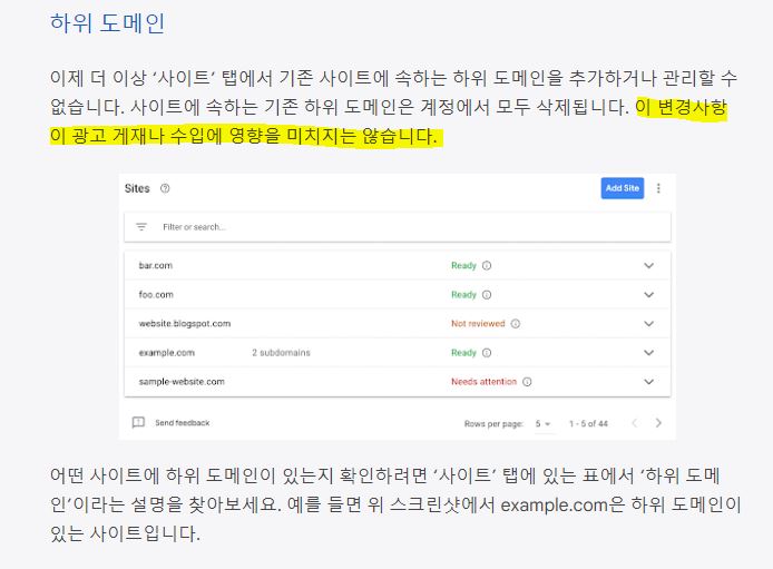 애드센스의 하위도메인이 삭제되는 것이 아니라 하위도메인 탭이 삭제된다고 이야기합니다.