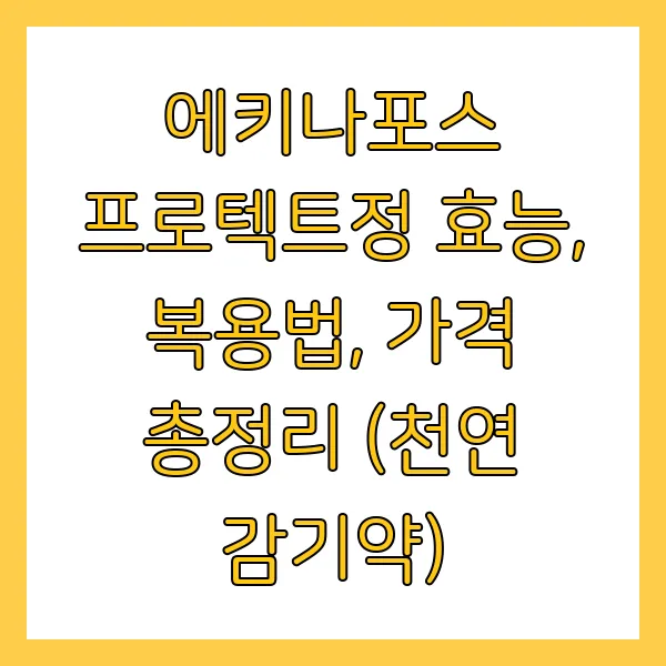 감기 기운이 느껴질 때, 혹은 면역력 강화를 위해 에키나포스 프로텍트정을 고려하고 계신가요? 천연 감기약으로 알려진 에키나포스 프로텍트정의 효능, 복용법, 가격, 그리고 꼭 알아야 할 주의사항까지! 이 글 하나로 모든 궁금증을 해결해 드립니다. 에키나포스 프로텍트정, 제대로 알고 복용해야 효과를 톡톡히 볼 수 있겠죠?