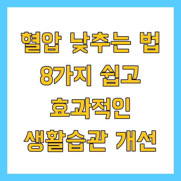 고혈압, 이른바 '침묵의 살인자'는 눈에 띄는 증상 없이 심각한 심혈관 질환으로 이어질 수 있습니다. 하지만 걱정 마세요! 생활 습관 개선으로 혈압 관리가 충분히 가능합니다. 이 글에서는 2024년 최신 지침에 따라 쉽고 효과적인 8가지 혈압 낮추는 방법을 자세히 알려드립니다. 혈압 관리 팁, 고혈압 예방법, 심혈관 건강 관리법 등을 통해 건강한 삶을 유지하세요!