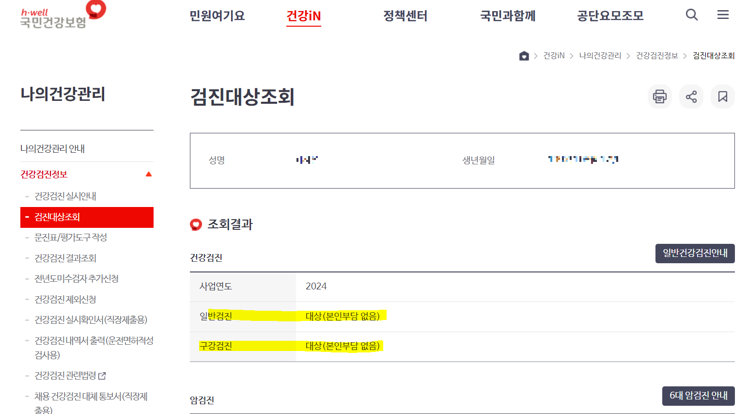 해당하는 것처럼 올해 건강검진 대상자 라면 검진 대상자라고 나오고 그렇지 않은경우에는 대상 아님이 표시 됩니다.