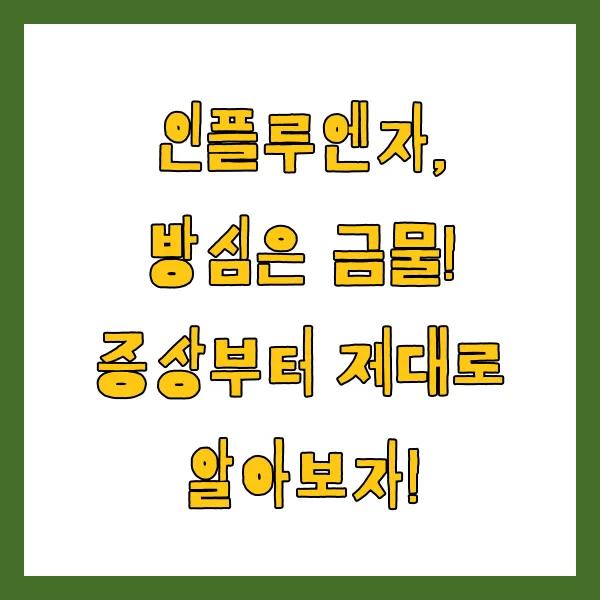 인플루엔자는 방심할 경우 폐렴, 기관지염, 심근염, 뇌염 등의 심각한 합병증을 유발할 수 있는 위험한 질병입니다. 심한 경우 생명까지 위협할 수 있으므로, 예방에 만전을 기해야 합니다 . 적극적인 예방접종, 철저한 개인위생 수칙 준수, 유행 상황 모니터링 등을 통해 나와 가족, 그리고 공동체의 건강을 지키는 데 최선을 다합시다! 더 자세한 정보는 질병관리청 웹사이트(kdca.go.kr) 에서 확인하실 수 있습니다. ^^
